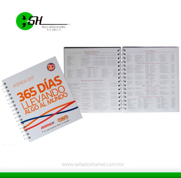 Agenda: Tamaño escritorio en papel bond blanco de 90 grs. impreso a 2 tintas.