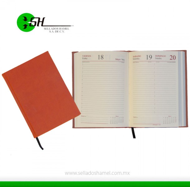 Agenda: Diaria en papel bond ahuesado de 90 grs. impresa a 2 tintas, y encuadernada con 347 pág.