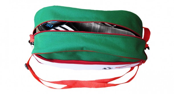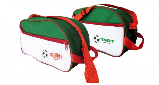 Artículo: Zapatera promocional con asa ajustable, cierre y compartimiento frontal.